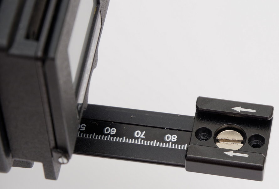 Es gibt eine Strebe für einen Halter für gerahmte Dias und 35mm Filmstreifen. Der Verstellweg ist zu kurz für längere Brennweiten, wie hier 75 mm Brennweite für eine Kamera mit APS-C Sensor.