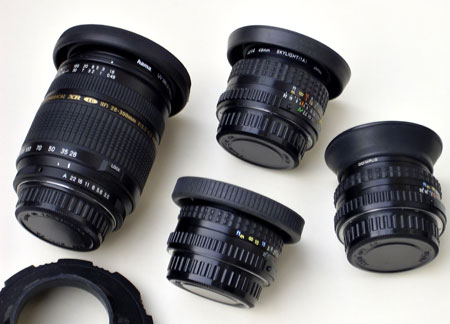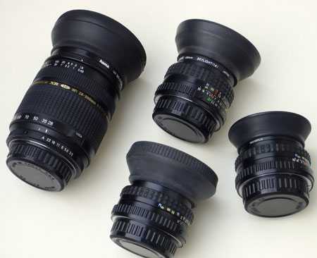 Die gute alte Sonnenblende aus Gummi (auch: Streulichtblende / Gegenlichtblende) gibt es in verschiedenen Größen und ist ein wirksames Mittel, um Optiken gegen seitlich einfallendes Licht abzuschatten, was der Brillanz der Aufnahmen zugute kommt. Auch multivergüteter Linsenoberflächen können Streulicht und Reflexionen in den optischen Systemen der Objektive nicht völlig unterdrücken. Daher sind Sonnenblenden wichtig. Weiterhin federn Gummi-Sonnenblenden Stöße gegen Objektive ab.
