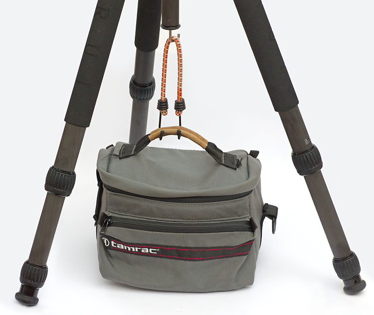 Ein Haken unterhalb des Stativs ermöglicht es, ein Gewicht daran zu hängen. Das kann ein Rucksack sein oder die Fototasche. Dadurch verlagert man den Schwerpunkt des gesamten Aufbaus nach unten und erhöht somit die Standfestigkeit beispielsweise bei Wind. Aber Wind kann ein frei hängendes Gewicht auch zum Schwingen bringen, das auf das Stativ übertragen wird. Daher steht die Fototasche auf dem Boden und wird mittels eines Spanngurts mit dem Haken am Stativ verbunden.