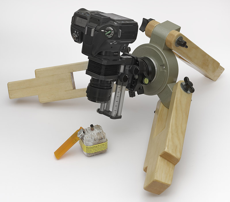 Mobiler Einsatz mit kleinem, stabilen Stativ und grosser Powerbank. Wemacro Rail auf Sirui VH-10 Fluid-Videoneiger. An der Pentax DSLR befindet sich eine Makroschnecke mit einem Rodenstock Rodagon Apo 80mm Objektiv.