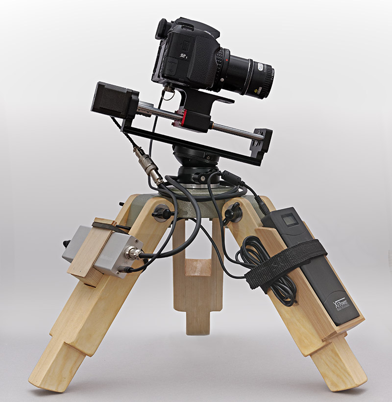 Mit einem Gummiband undKlettverschluss ist eine sichere Befestigung möglich. Die Powerbank hat unteranderem einen 12 V Ausgang für den Controller. Insgesamt ist das eine exzellente Lösung für den Einsatz desWemacro Stacking Schlittens. Das Stativ ist im Verhältnis zur Traglast superstabil und nahezu perfekt. Mit etwas handwerklichem Geschick dürfte ein Nachbau wohlniemanden überfordern.