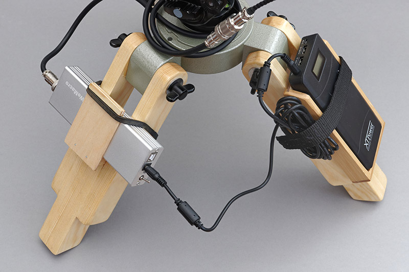 Zur Verbesserung baute ich ein weiteres niedriges Stativ. Es kam auch eine kleinere und leichtere Powerbank zum Einsatz. Sämtliche Teile konnten nun am Stativ befestigt werden, sodass eine Veränderung desStandortes leichter wurde und außerdem keine elektronischen Teile mehr am Bodenlagen. Schließlich war der im Freien nicht immer sauber oder trocken. Dafür verwendete ich dieBasis eines anderen Stativs und ersetzte dessen Beine durch sehr kurze, selbstgebastelte Holzbeine mit hoher Verstellbarkeit, um auch sehr nahe am Bodenarbeiten zu können.
