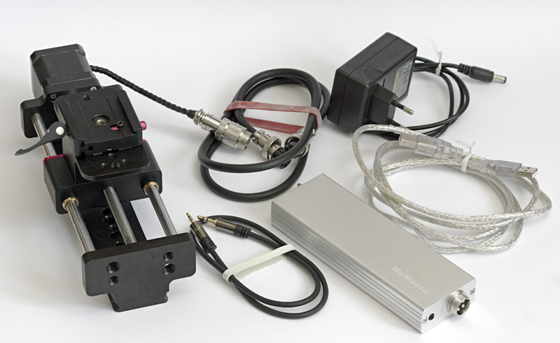 Lieferumfang: Einstellschlitten, Netzteil, Controller mit Kabel und Kabel zum Auslösen der Kamera. Den einfachen Batteriehalter führen wir nicht auf, weil eine gute Powerbank mit 12 DC Anschluss die weitaus bessere Lösung ist.