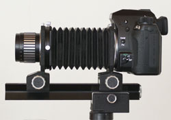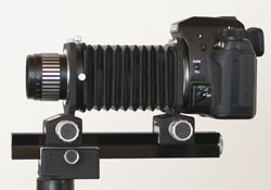 Kamera mit Blitz (indirekt blitzen!!), Balgen und Objektiv in der Makrofotografie