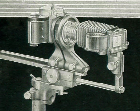 Balgengeräte werden seit langem zum Duplizieren von Filmen verwendet. Hier ist das 'Ihagee Vielzweckgerät', mit Filmhalter zu sehen.