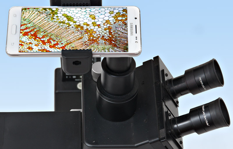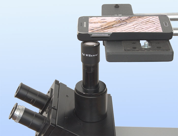 2018 © Thomas GadeModerne Smartphone sind sehr gut für die Fotografie am Mikroskop geeignet. Kameras mit größeren Sensoren bieten eigentlich keine Vorteile, weil das optische System eines Lichtmikroskops aus physikalischen Gründen ihre hohe Auflösung gar nicht ausreizen kann. Wie funktioniert das? Das Smartphone 'blickt' in ein Okular. Dazu muss es im richtigen Abstand und Ausrichtung positioniert werden.