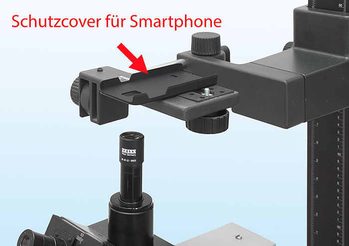 Adaptierung mit Hilfe einer Reprosäule. Eine Smartphone Klemme mit Stativschraube (ca. 10-20 €) wird an das Reprostativ geschraubt. Das Mikroskop wird auf dem Grundbrett passend verschoben. Der richtige Abstand zwischen dem senkrecht nach oben ragenden Okulars und dem Objektiv des Smartphones ist mit der Reprosäule sehr leicht einzustellen.