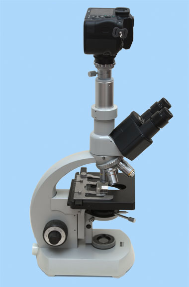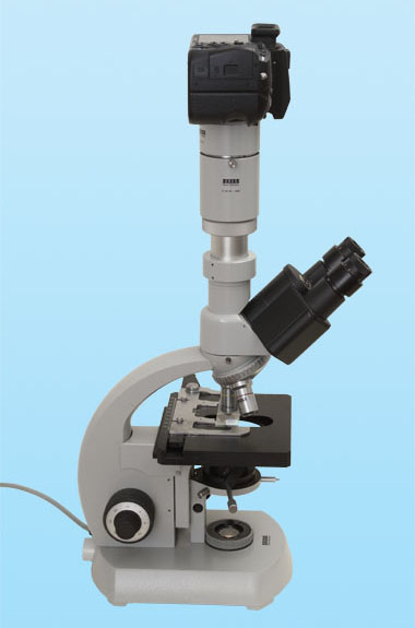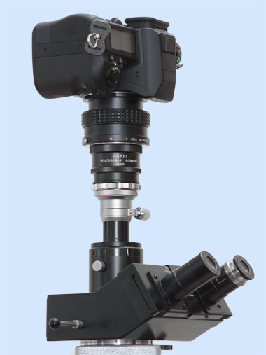 Zwischen einem Kameragehäuse (ohne Fotoobjektiv) und dem Mikroskopobjektiv befindet sich ein Projektiv, also ein spezielles Okular zur Optimierung des vom Objektiv geworfenen Bildes für eine Projektion auf eine ebene Fläche. Die Optik des Projektivs muss zum Objektiv passen. Man redet auch vom Fotookular.