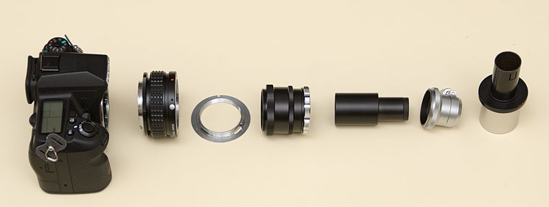 ![]() 2. Zum Adaptieren braucht man einen T2 Adapter, zwei Zeiss Tuben (einer mit Optik) und ein Kpl W 10x/18 Okular |