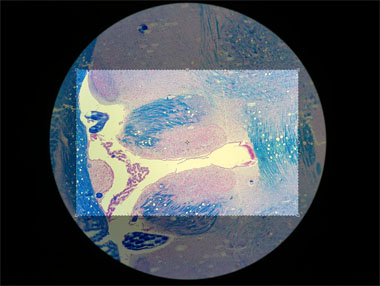 Blickt man durch das Okular in ein Mikroskop, sieht man ein kreisrundes Bild. Beim Fotografieren durch ein Mikroskop wird jedoch ein rechteckiger Sensor belichtet. Zur Vermeidung von Randabschattungen durch den runden Bildrand, fotografiert man deshalb einen rechteckigen Ausschnitt, der im besten Fall so gewählt ist, dass der dunkle Rand gerade außerhalb des fotografierten Bildes liegt.