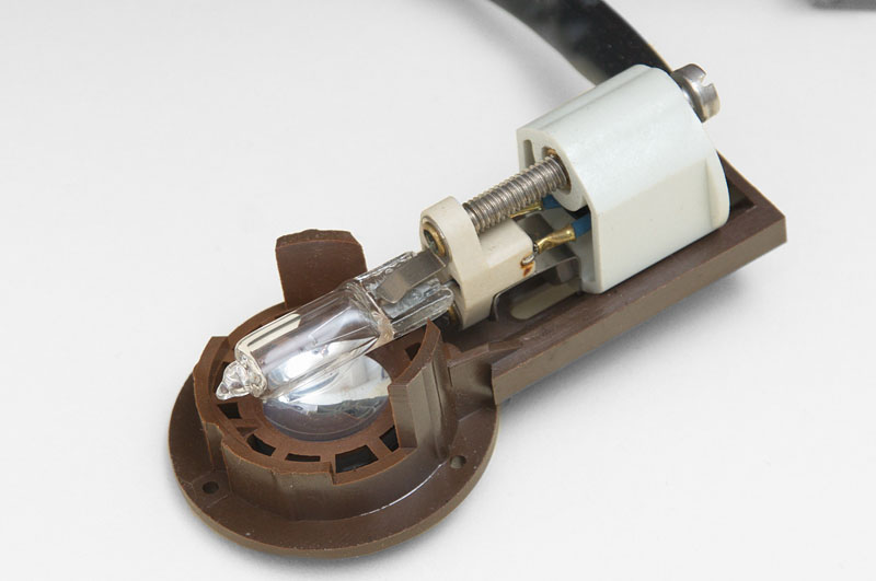 Beleuchtung im Sockel des Mikroskops. Dort ist der Transformator untergebracht. Der 6V/10W Halogenbrenner befindet sich in einer Halterung unterhalb der Leuchtfeldblende.