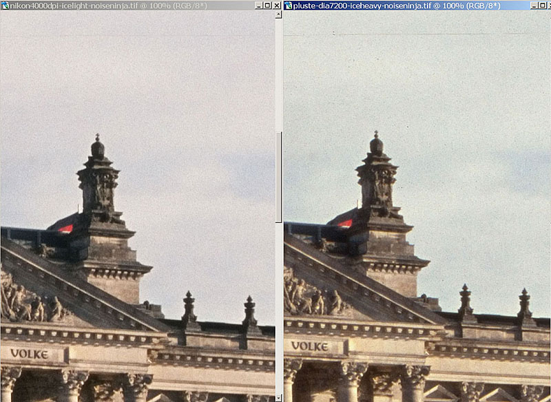 Das erste Bildpaar zeigt zwei Ausschnitte, die sich in punkto Schärfe und Auflösung kaum unterscheiden. In gleicher Weise hatte ich vorher die nicht reduzierte 7200 dpi Datei mit der Nikondatei verglichen. Sie sah genauso aus und die 7200 dpi bringen nicht mehr Details. Die Infrarotreinigung der Plustekdatei funktioniert bei 7200 dpi nicht so gut wie beim Nikon. Vor allem werden Störungen in relativ homogenen Bereichen weniger wirksam korrigiert. Bei 3600 dpi werden Schmutz und Kratzer effektiver beseitigt! .
