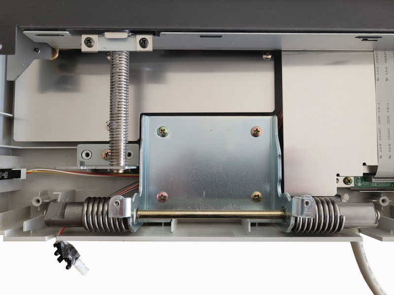 Teil des Gelenks / Scharniers der TPU im geöffneten Durchlichtdeckel. Auf einer Achse befinden sich zwei Federn um dicke Metallbolzen. Sie zusammen bilden ein gebremstes Scharnier, um den Deckel zu öffnen oder zu schließen.