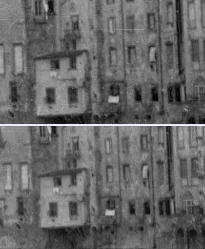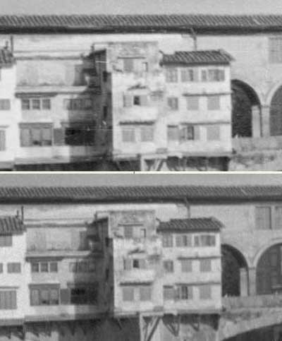 Auf der rechten Seite sieht man, dass der Nikon in den Fenstern deutliche Tonwertsprünge zeigt. Das Nikonbild wirkt detailreicher, doch der Eindruck wird durch weisse Kratzer und Flecken erzeugt als durch echte Bildelemente. Der Polaroid liefert eine angenehmere Darstellung. Das untere Bild ließe sich mit der Unscharf Maskierung gut nachschärfen, während das obere Bild eine drastische Betonung des Korns und der Kratzer zeigen würde. Beim Polaroid ist eine Kornunterdrückung (GEM) unnötig.