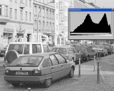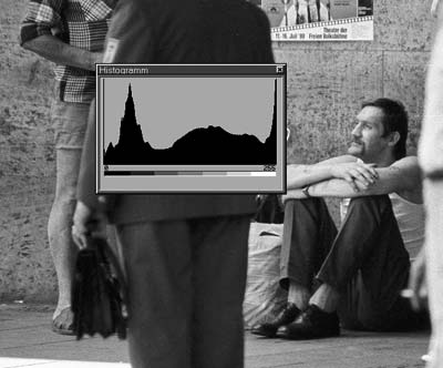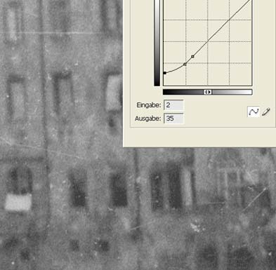 Für konventionelle Schwarzweissfilme, deren maximale Detailauflösung in der Regel mit einem guten 2700 dpi Scanner erreicht wird, ziehe ich den alten Polaroid Sprintscan 35 Plus vor. Er ist schnell und man spart eine Menge Nachbearbeitungszeit, weil die ICE-Funktion des Nikon für diese Vorlagen nicht anzuwenden ist. Saubere glatte Negative verarbeitet der Nikon ganz gut, wenn man seine Erfahrungen mit der Software gemacht hat und sich ein (automatisches) Korrekturverfahren in einer nachfolgenden Bildverarbeitung entwickelt hat. Im Photoshop kann man einen Bearbeitungsablauf programmieren, der auf die einzelnen Bilder angewandt wird. Die nachstehenden Bildausschnitte zeigen, dass die scharzen Stellen im Bild mit der Gradationskurve an ihre Umgebung angepasst werden können. Anschliessend wird der Schwarzpunkt neu gesetzt. Damit erzielt man eine gute Dateien. Die Scandateien werden im 16 Bit Modus ausgeben.
