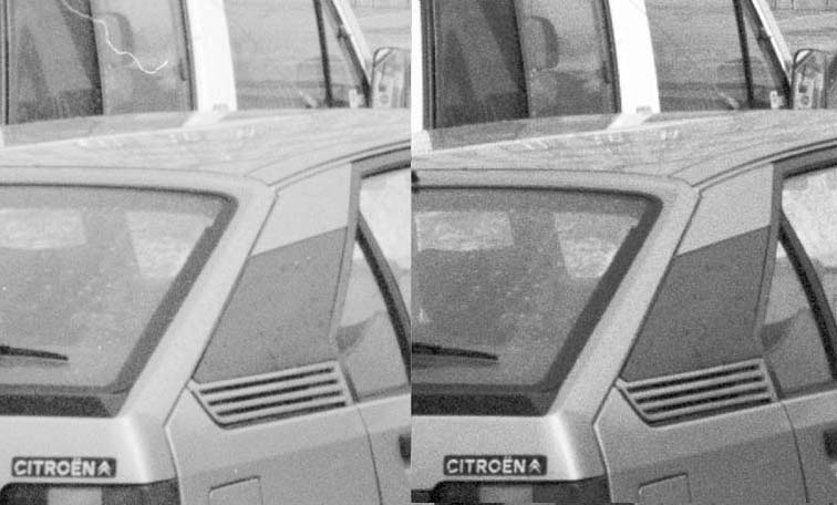 Im Polaroid Scan sieht man links oben einen Staubfaden, der auf der rechten Seite nicht zu sehen ist. Nikon und ICE machen es möglich. Welcher ist besser? Man achte auf den Schriftzug 'Citroen'. Beim Nikon wirken die Buchstaben schärfer. Doch läßt sich die etwas weichere Polaroid Datei schärfen.