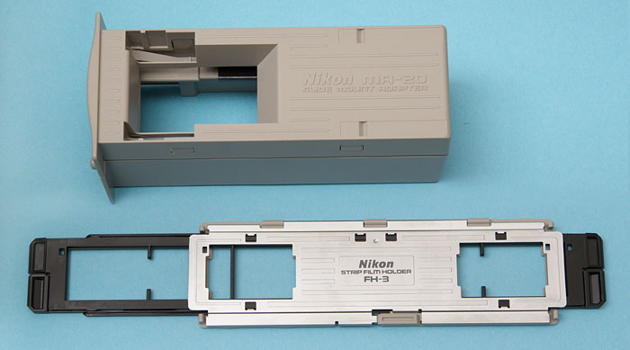 Der Strip Film Holder FH-3 für einzelne Filmstreifen gehörte zum Lieferumfang des Nikon Coolscan 4000, wurde jedoch seinem Nachfolger, dem Nikon Coolscan 5000, nicht mehr beigelegt und kostet auf dem Gebrauchtmarkt 70 - 100 € (Juni 2016). Das ist reichlich für eine klapperige Konstruktion. Der Nikon MA-20 ist ein Adapter für einzelne gerahmte Dias und den Filmstreifenhalter FH-3.