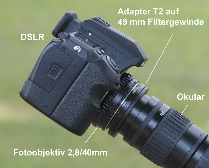 Ohne Okular und Fotoobjektiv mit speziellem DSLR Fotoadapter