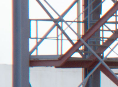 Zum Vergleich wurde die Treppe eines Kraftwerks mit der Pentax K-5 II (DSLR) mit und ohne SMC-Pentax 2,8/40 mm Objektiv an einem Kowa Prominar TSN 883 Spektiv fotografiert. Erstaunlicherweise sieht man in beiden Fällen fast den selben Bildwinkel. Die Belichtungszeit betrug 1/60 Sekunde und die Luft flimmerte etwas. Deshalb sind die Aufnahmen etwas unscharf.