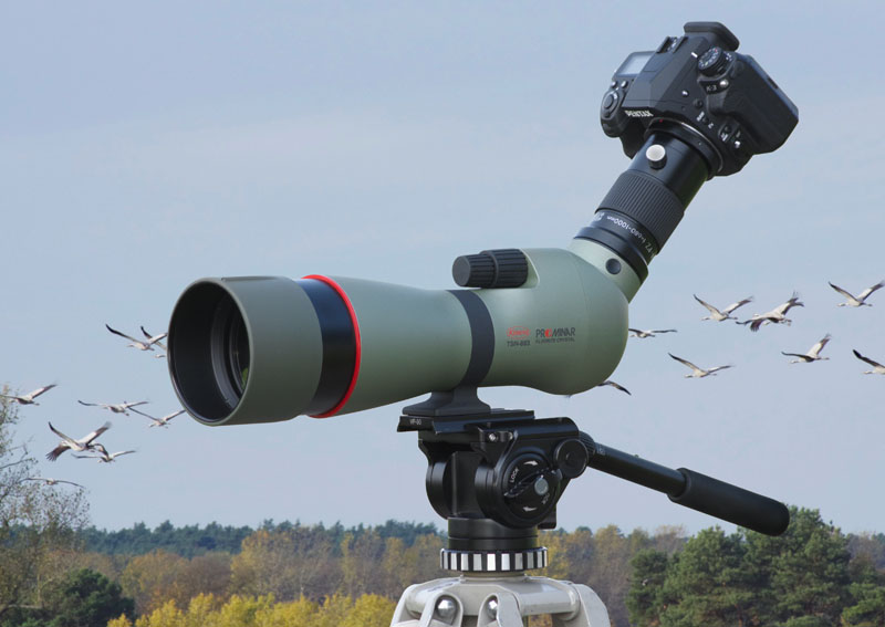 Kowa Prominar TSN-883, Kowa TSN-PA7 mit Pentax K-3 und 2,8/40mm Objektiv beim Digiscoping. Mit dem Spektiv kann man sehr gute Fotos und Filme aufnehmen.