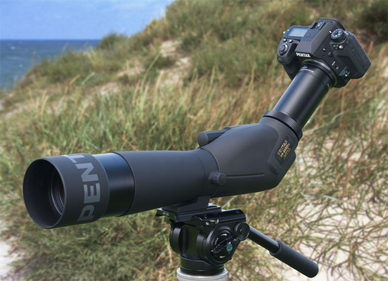 Für Pentax Spektive gibt es den Fotoadapter PF-CA35 (400 €) mit integrierter Optik. Er wird anstelle des Okulars eingesetzt und die Kamera wird ohne Fotoobjektiv daran montiert. Leider kann der teure Adapter die hohe Bildqualität des Spektivs nicht befriedigend fotografisch umsetzen. Mehr darüber: Pentax Camera Digiscoping Adapter PF-CA35