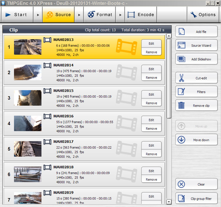 Anschließend wird TMPGenc geöffnet. Man klickt auf den Reiter 'Source'. Parallel wird der Dateimanager des Betriebsystems geöffnet, und im oben erwähnten Ordner alle Clips markiert und auf das Programm TMPGenc gezogen. Das Programm zeigt die Clips nicht streng nach Namen sortiert an. Daher verschiebt man sie zunächst untereinander so, dass eine erste Sortierung stattfindet.