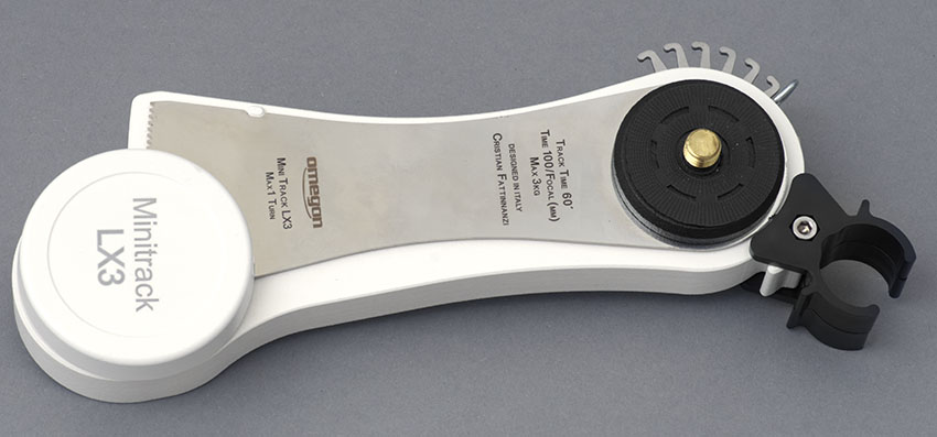 Die Omegon Mini Track LX3 ist eine Nachführeinrichtung für Fotoapparate mit kurzen bis mittleren Brennweiten. Sie ist einfach und genial. Ihr Antrieb wird mit dem Drehrad am unteren Ende rasch aufgezogen und nimmt mit leisem Klackern ihre Arbeit auf. Am Ende klingelt sie wie eine Eieruhr.
