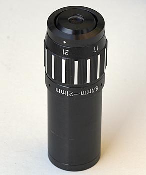 8,4 - 21 mm Zoomokular. Ein frühes Modell dieses Typs. Die optische Qualität litt unter dem geringen Gesichtsfeld bei längeren Brennweiten.