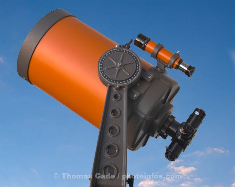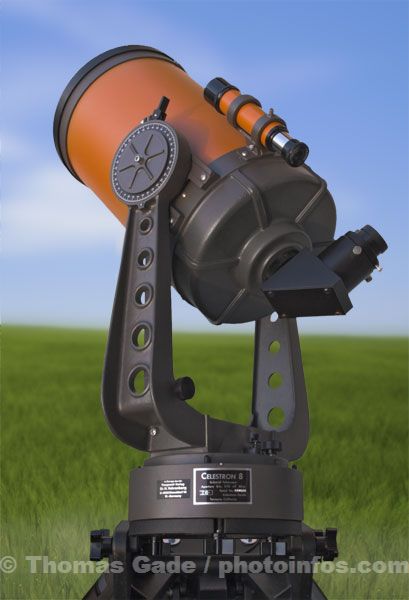 Das dargestellte Schmidt-Cassegrain Teleskop (SCT) mit 8 Zoll / 20 cm Öffnung mit orangem Tubus in originaler Gabel wurde 1981 an seinen Erstbesitzer verkauft. Die Schmidt-Platte dieses Models ist noch unvergütet. Celestron produzierte die ersten SCTs in den 1960'ern. 1970 bestand die Palette der Celestron SCTs aus den Typen C6, C8, C10, C12, C16 und C22. Die Zahlen stehen jeweils für die Teleskopöffnung in Inch oder Zoll. Der Teleskoptyp wurde schnell populär, weil große Öffnungen mit kurzen Baulängen kombiniert werden konnten. Ein Refraktor mit 20cm Öffnung war damals mindestens 2,5 Meter lang, sehr schwer und sehr teuer. Dagegen sind SCTs bis zum C12 von einer (kräftigen) Person im PKW transportier- und aufbaubar. Im Laufe der Jahrzehnte hat sich grundsätzlich wenig an diesen Teleskopen verändert.Das hier gezeigte Modell zeigt bei guten Sichtbedingungen (transparente Luft, wenig Flimmern etc.) trotz der fehlenden Vergütung der Schmidtplatte scharfe Bilder. Unter Astronomen haben die alten orangen Celestrons einen guten Ruf. Sie sollen handretuschiert sein, während spätere Versionen mit Massenfertigungsanlagen hergestellt wurden und angeblich etwas an Qualität einbüßten.