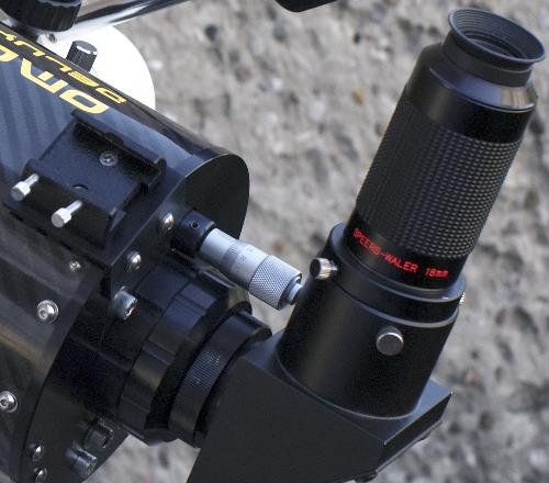Wie man am nächsten Bild erkennt, ist ein Speers Waler Okular schon recht groß, gehört aber noch nicht ans Ende der Fahnenstange. Auf dem Bild sieht man ein 2" Zenitspiegel, der mit dem SC Gewinde fest an das Teleskop geschraubt wurde. Die Kombination ist stabil genug, um das große Okular zu halten.