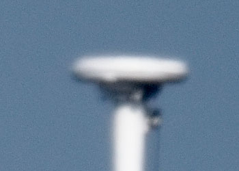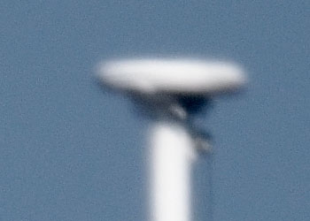 Die Bilder zeigen die enorme Reichweite des OMC 140. Dessen 2 Meter Brennweite holen weit Entferntes nahe heran. Der negative Einfluss unruhiger Luft, durch die das Licht wandert, ist bei der Brennweite beträchtlich. Ich habe das Motiv mit völlig unveränderter Einstellung zehn mal nacheinander mit Hilfe eines drahtlosen Fernauslösers und Spiegelvorauslösung durch das OMC140 auf einem sehr soliden Linhof-Stativ bei Windstille aufgenommen. Die Ergebnisse unterschieden sich stark im Detail, was die nachfolgenden Ausschnitte gut darstellen.