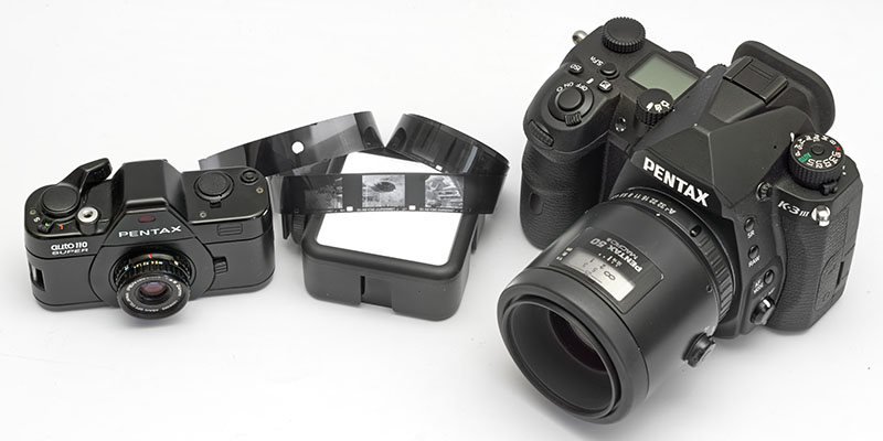 Pocketkamera Pentax auto 110 super neben DSLR Pentax K-3 III